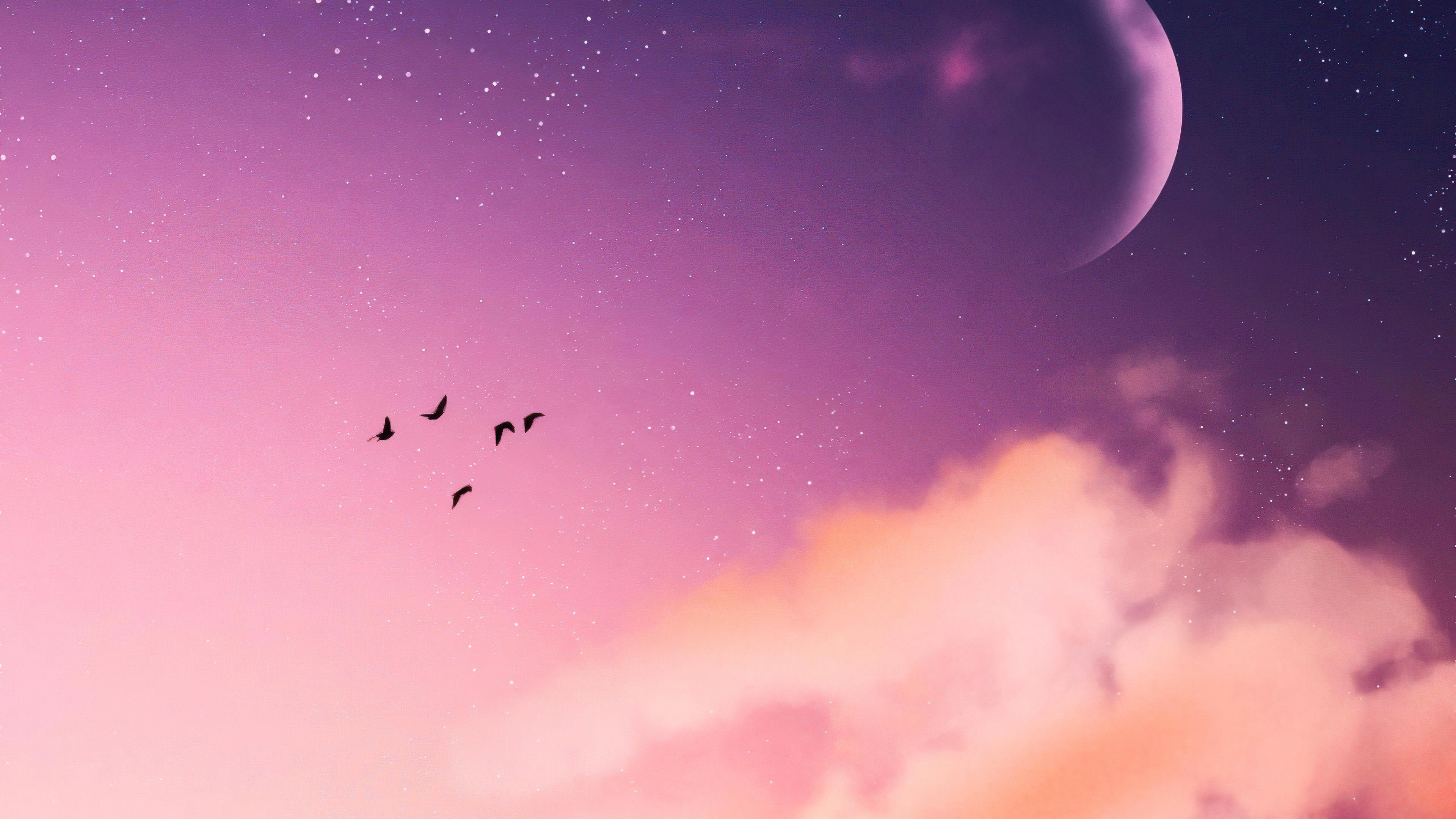 Mountains Moon Lake Birds 4k Wallpaper