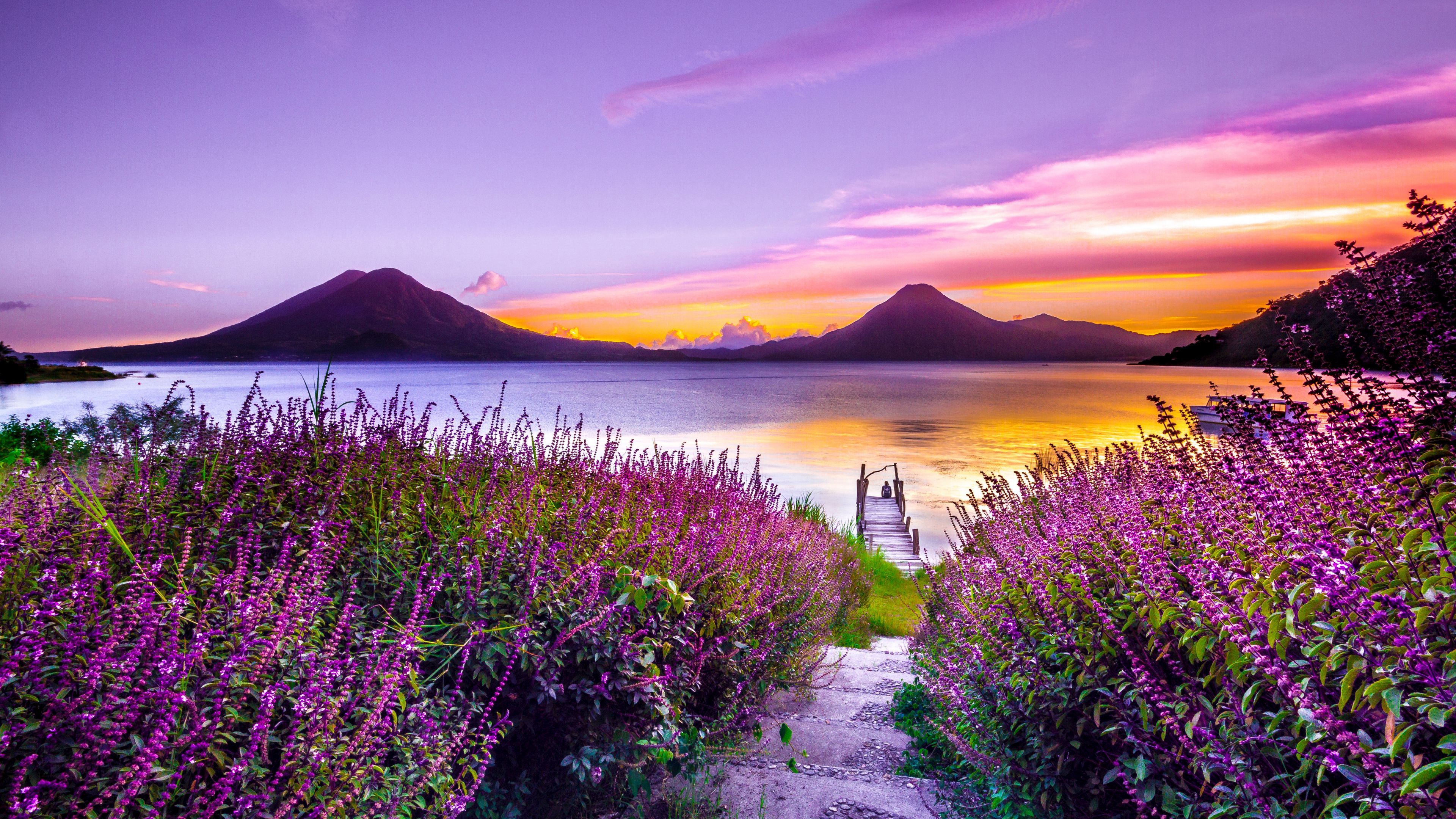 Beautiful Yellow Purple Sky Above River And Closeup View Of Lavender Flowers 4K HD Nature Wallpaper