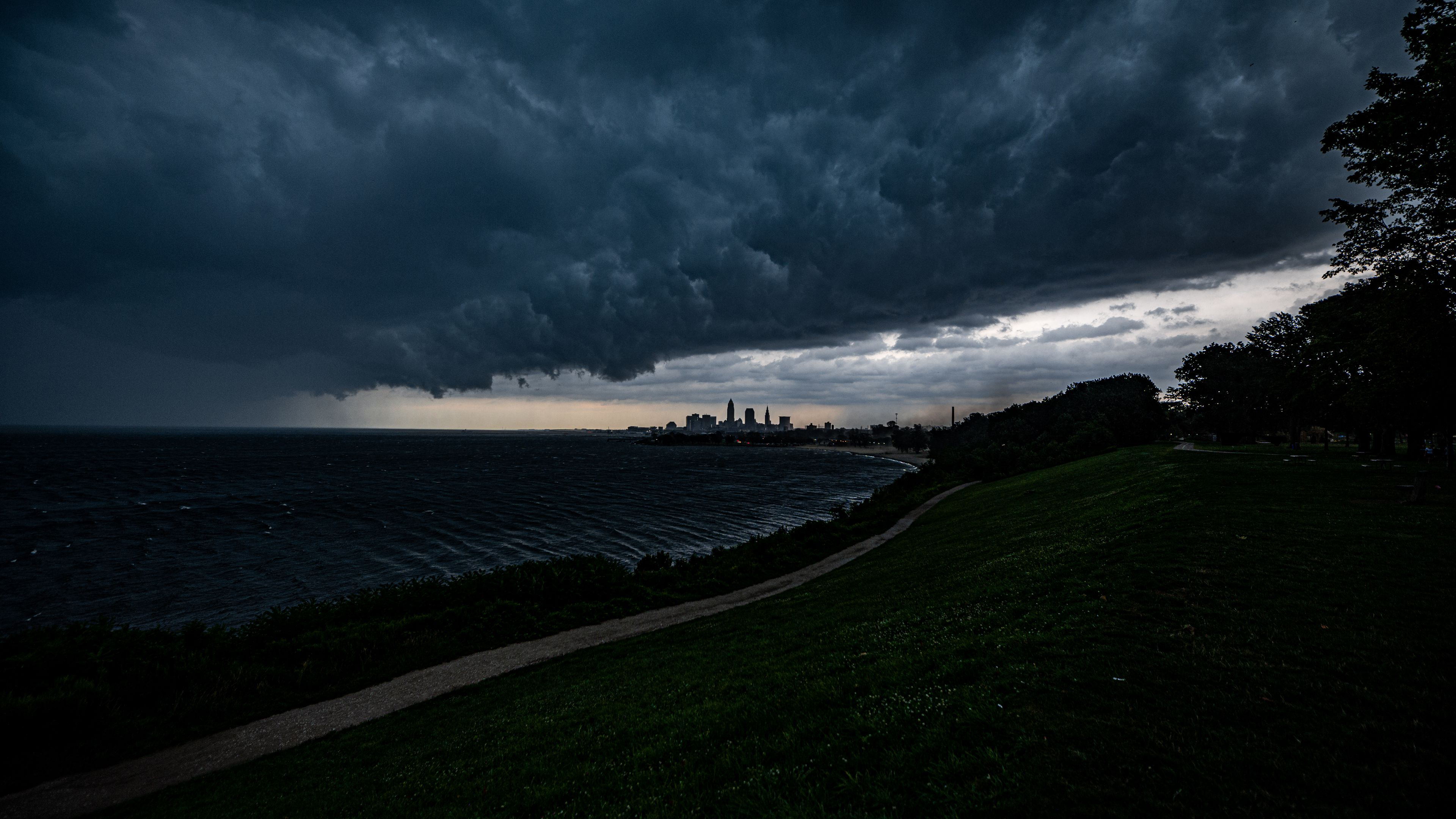 Road Between Green Grass Slope And Ocean Buildings Under Black Clouds White Sky 4K HD Nature Wallpaper