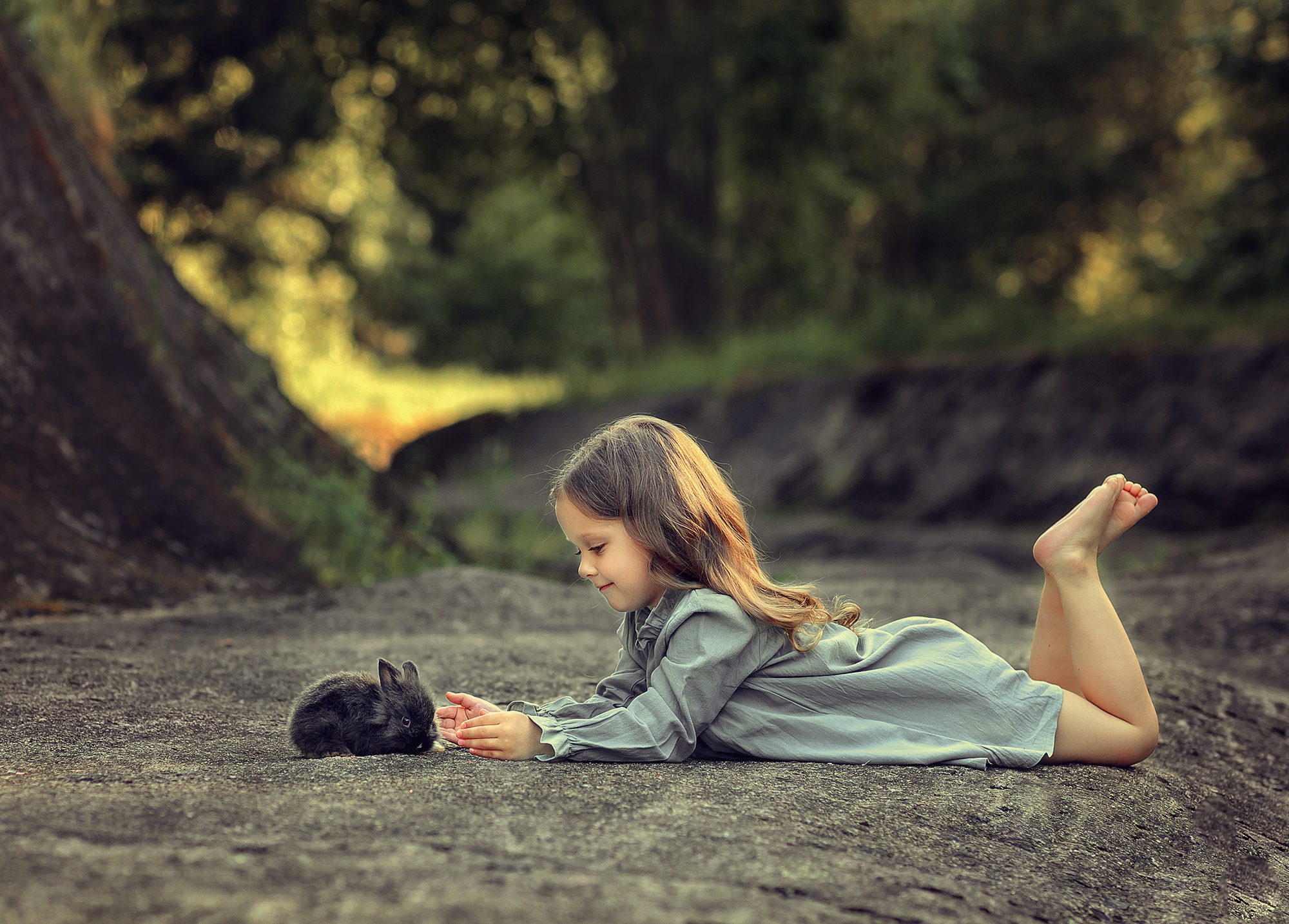 Little Girl Lying Down And Playing With Rabbit Wallpaper