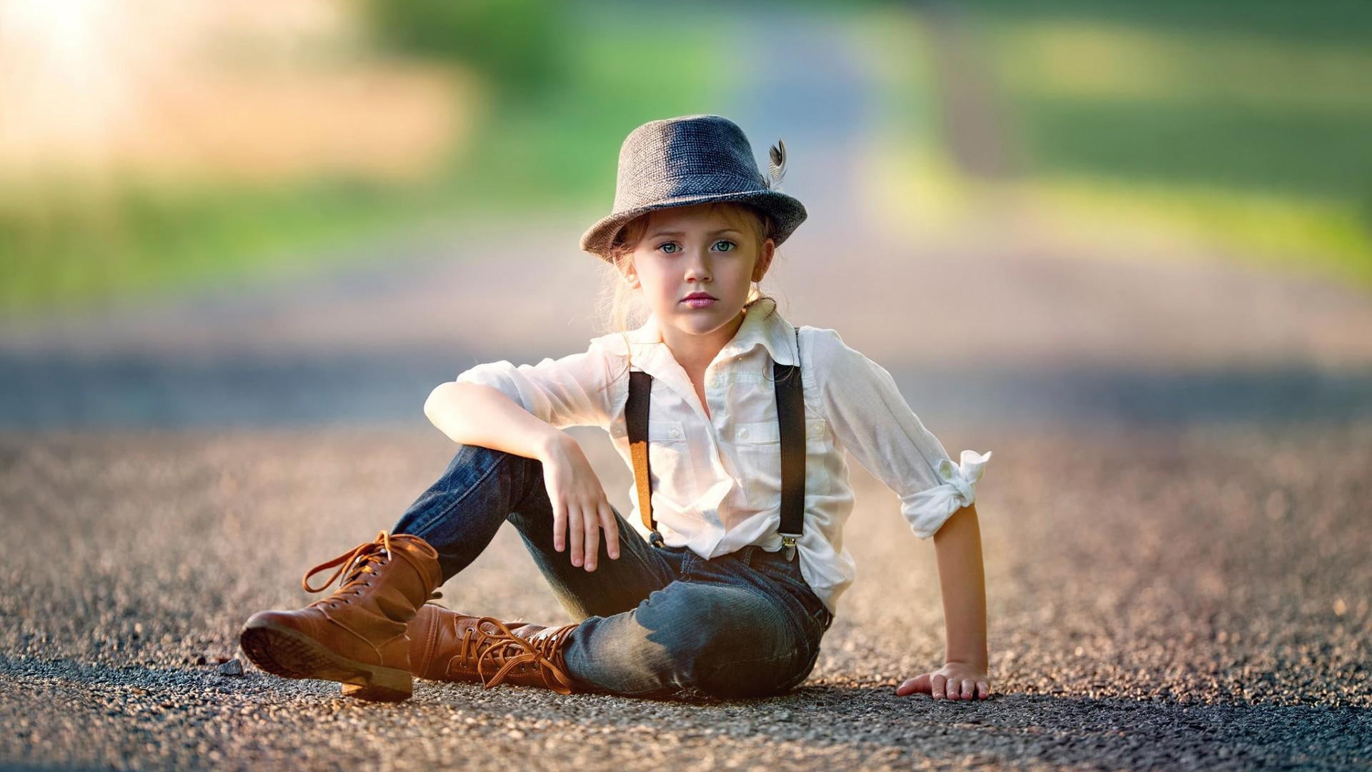 Cute Little Girl Is Sitting On Road Wearing White Blue Dress And Hat In Blur Green Background HD Cute Wallpaper