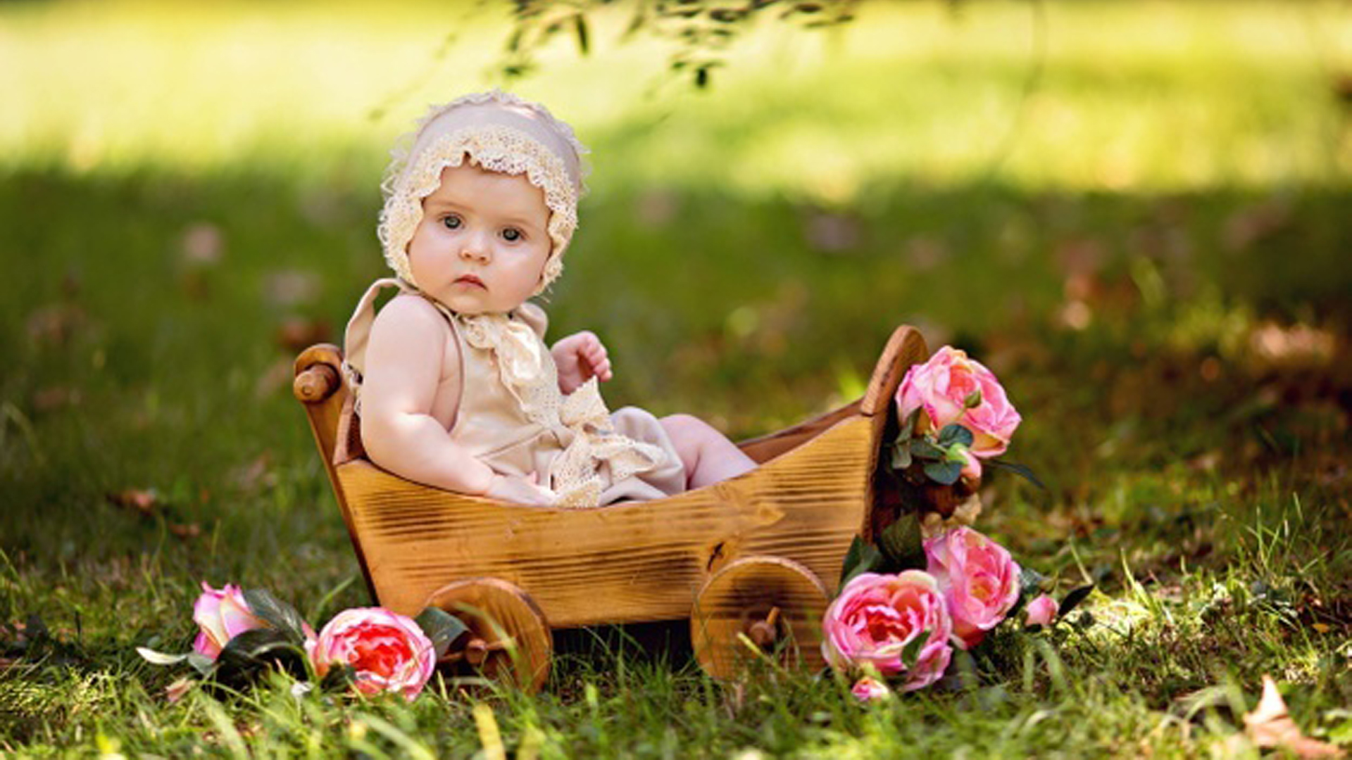 Cute Little Baby Girl Is Sitting On Toy Cart With Rose Flowers In Blur Green Bokeh Background HD Cute Wallpaper